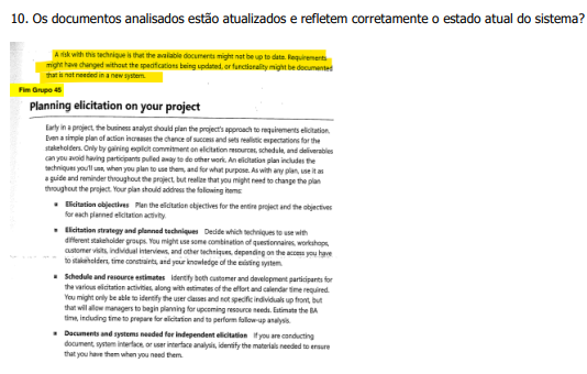 | 10 | Os documentos analisados estão atualizados e refletem corretamente o estado atual do sistema? | WIEGERS, Karl; BEATTY, Joy. Software Requirements. 3. ed. Redmond: Microsoft Press, 2013. P.129. | Img - Item 10 | Angélica |