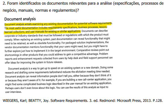 | 02 | Foram identificados os documentos relevantes para a análise (especificações, processos de negócio, manuais, normas e regulamentos)? | WIEGERS, Karl; BEATTY, Joy. Software Requirements. 3. ed. Redmond: Microsoft Press, 2013. P.128. | Img - Item 2 | Angélica |
