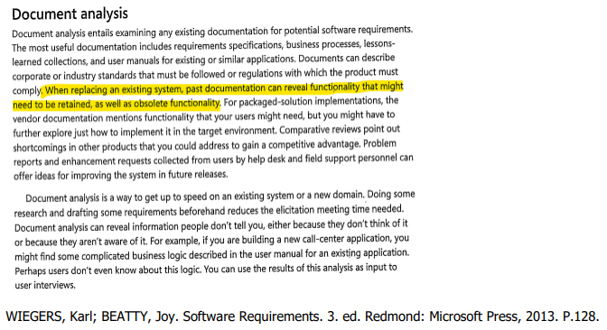 | 03 | A análise expos funcionalidades que devem ser mantidas e funcionalidades obsoletas a serem descartadas? | WIEGERS, Karl; BEATTY, Joy. Software Requirements. 3. ed. Redmond: Microsoft Press, 2013. P.128. | Img - Item 3 | Angélica |