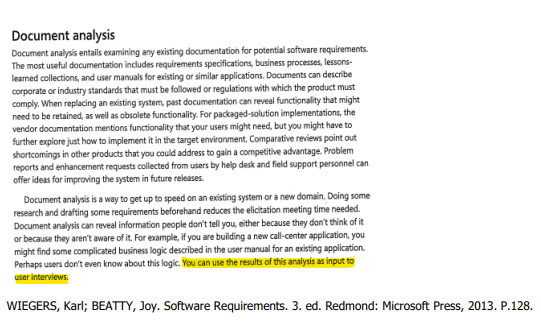 | 05 | Os resultados da análise foram usados como entrada para complementar outras técnicas de elicitação (ex.: entrevistas, observação)? | WIEGERS, Karl; BEATTY, Joy. Software Requirements. 3. ed. Redmond: Microsoft Press, 2013. P.128. | Img - Item 5 | Angélica |
