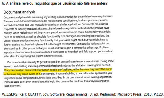 | 06 | A análise revelou requisitos que os usuários não falaram antes? | WIEGERS, Karl; BEATTY, Joy. Software Requirements. 3. ed. Redmond: Microsoft Press, 2013. P.128. | Img - Item 6 | Angélica |