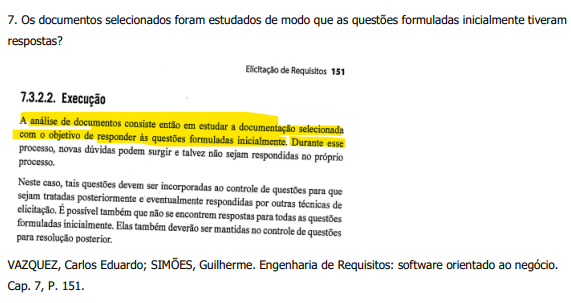 | 07 | Os documentos selecionados foram estudados de modo que as questões formuladas inicialmente tiveram respostas? | VAZQUEZ, Carlos Eduardo; SIMÕES, Guilherme. Engenharia de Requisitos: software orientado ao negócio. Cap. 7, P. 151. | Img - Item 7 | Angélica |