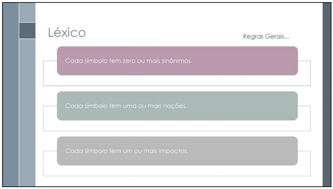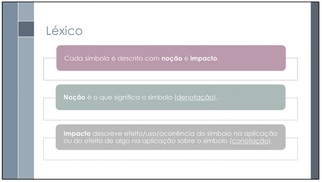Busca-se assegurar que os símbolos (termos do domínio) estejam adequadamente definidos, classificados e estruturados, servindo como uma ferramenta eficaz para capturar e comunicar o vocabulário específico do domínio da aplicação entre todos os stakeholders envolvidos no projeto.