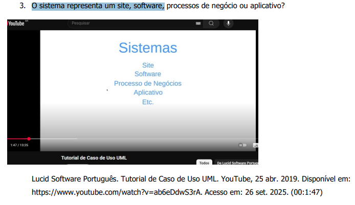 | 22 | O sistema representa um site, software, processos de negócio ou aplicativo? | Lucid Software Português. Tutorial de Caso de Uso UML. YouTube, 25 abr. 2019. Disponível em: https://www.youtube.com/watch?v=ab6eDdwS3rA. Acesso em: 26 set. 2025. (00:1:47) | Img - Item 22 | Angélica |