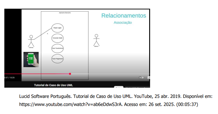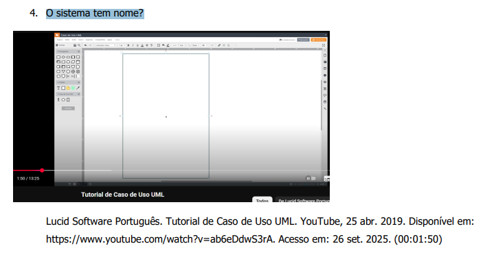 | 23 | O sistema tem nome? | Lucid Software Português. Tutorial de Caso de Uso UML. YouTube, 25 abr. 2019. Disponível em: https://www.youtube.com/watch?v=ab6eDdwS3rA. Acesso em: 26 set. 2025. (00:01:50) | Img - Item 23 | Angélica |