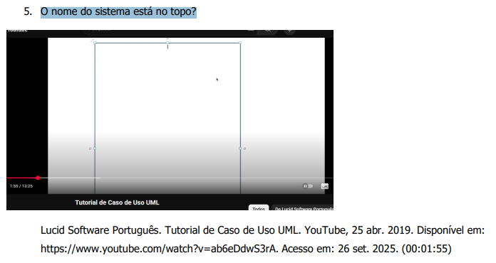 | 24 | O nome do sistema está no topo? | Lucid Software Português. Tutorial de Caso de Uso UML. YouTube, 25 abr. 2019. Disponível em: https://www.youtube.com/watch?v=ab6eDdwS3rA. Acesso em: 26 set. 2025. (00:01:55) | Img - Item 24 | Angélica |