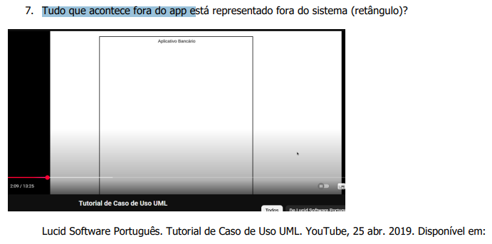 | 25 | Tudo que acontece fora do app está representado fora do sistema (retângulo)? | Lucid Software Português. Tutorial de Caso de Uso UML. YouTube, 25 abr. 2019. Disponível em: https://www.youtube.com/watch?v=ab6eDdwS3rA. Acesso em: 26 set. 2025. (00:02:09) | Img - Item 25 | Angélica |