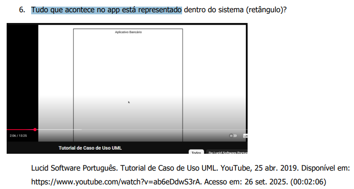 | 26 | Tudo que acontece no app está representado dentro do sistema (retângulo)? | Lucid Software Português. Tutorial de Caso de Uso UML. YouTube, 25 abr. 2019. Disponível em: https://www.youtube.com/watch?v=ab6eDdwS3rA. Acesso em: 26 set. 2025. (00:02:06) | Img - Item 26 | Angélica |