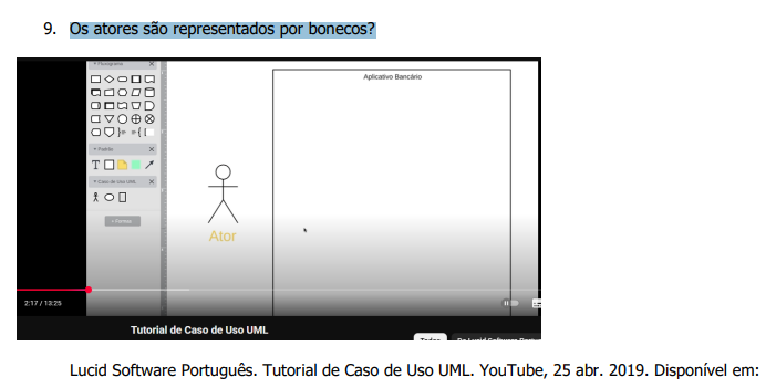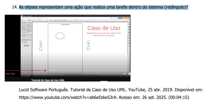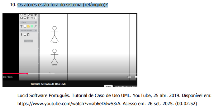| 28 | Os atores estão fora do sistema (retângulo)? | Lucid Software Português. Tutorial de Caso de Uso UML. YouTube, 25 abr. 2019. Disponível em: https://www.youtube.com/watch?v=ab6eDdwS3rA. Acesso em: 26 set. 2025. (00:02:52) | Img - Item 28 | Angélica |