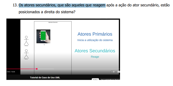 | 29 | Os atores secundários, que são aqueles que reagem após a ação do ator primário, estão posicionados a direita do sistema? | Lucid Software Português. Tutorial de Caso de Uso UML. YouTube, 25 abr. 2019. Disponível em: https://www.youtube.com/watch?v=ab6eDdwS3rA. Acesso em: 26 set. 2025. (00:03:44) | Img - Item 29 | Angélica |