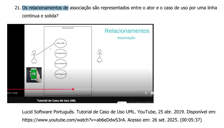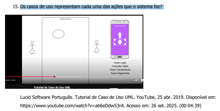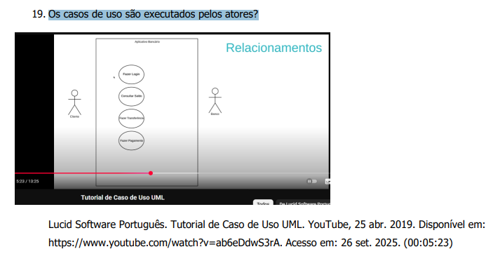 | 33 | Os casos de uso são executados pelos atores? | Lucid Software Português. Tutorial de Caso de Uso UML. YouTube, 25 abr. 2019. Disponível em: https://www.youtube.com/watch?v=ab6eDdwS3rA. Acesso em: 26 set. 2025. (00:05:23) | Img - Item 33 | Angélica |
