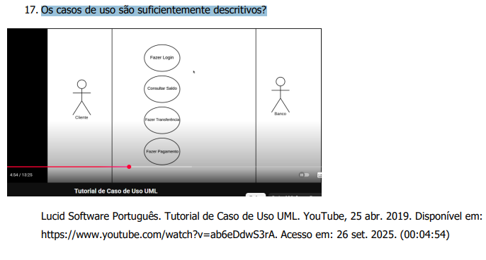 | 32 | Os casos de uso são suficientemente descritivos? | Lucid Software Português. Tutorial de Caso de Uso UML. YouTube, 25 abr. 2019. Disponível em: https://www.youtube.com/watch?v=ab6eDdwS3rA. Acesso em: 26 set. 2025. (00:04:54) | Img - Item 32 | Angélica |