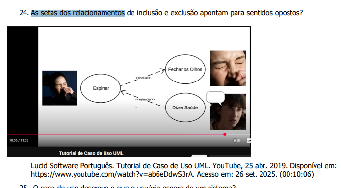 | 35 | As setas dos relacionamentos de inclusão e exclusão apontam para sentidos opostos? | Lucid Software Português. Tutorial de Caso de Uso UML. YouTube, 25 abr. 2019. Disponível em: https://www.youtube.com/watch?v=ab6eDdwS3rA. Acesso em: 26 set. 2025. (00:10:06) | Img - Item 35 | Angélica |