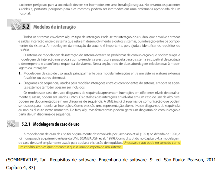 | 36 | O caso de uso descreve o que o usuário espera de um sistema? | SOMMERVILLE, Ian. Requisitos de software. Engenharia de software. 9. ed. São Paulo: Pearson, 2011. Capítulo 4, p. 87 | Img - Item 36 | Angélica |