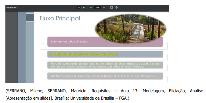 | 37 | Cada caso de uso possui apenas um fluxo principal, o que o ator realiza primeiro para usar a função? | SERRANO, Milene; SERRANO, Maurício. Requisitos – Aula 13: Modelagem, Eliciação, Analise. [Apresentação em slides]. Brasília: Universidade de Brasília – FGA. | Img - Item 37 | Angélica |