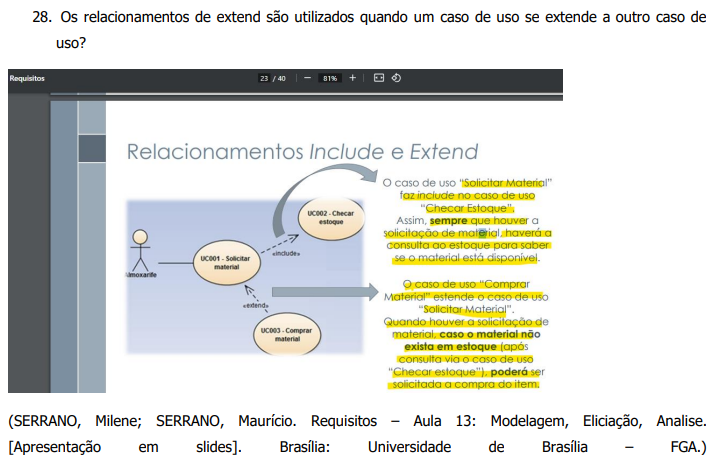 | 39 | Os relacionamentos de extend são utilizados quando um caso de uso se estende a outro caso de uso? | SERRANO, Milene; SERRANO, Maurício. Requisitos – Aula 13: Modelagem, Eliciação, Analise. [Apresentação em slides]. Brasília: Universidade de Brasília – FGA. | Img - Item 39 | Angélica |