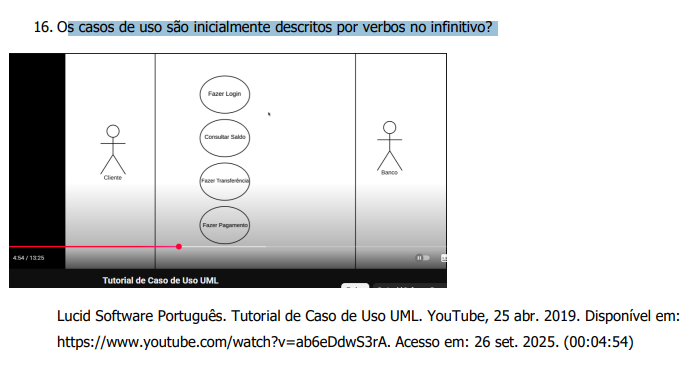 | 40 | Os casos de uso são inicialmente descritos por verbos no infinitivo? | Lucid Software Português. Tutorial de Caso de Uso UML. YouTube, 25 abr. 2019. Disponível em: https://www.youtube.com/watch?v=ab6eDdwS3rA. Acesso em: 26 set. 2025. (00:04:54) | Img - Item 40 | Angélica |