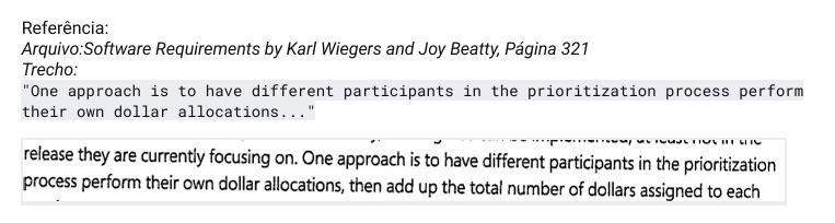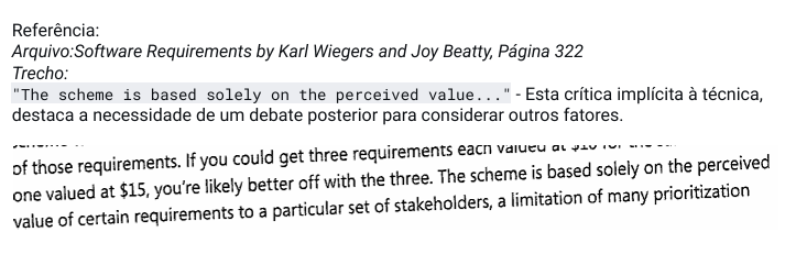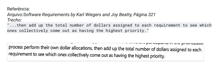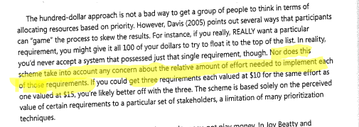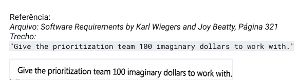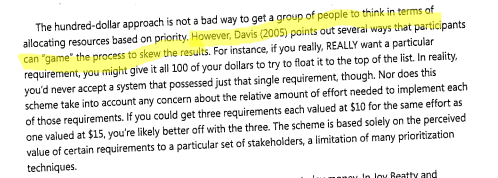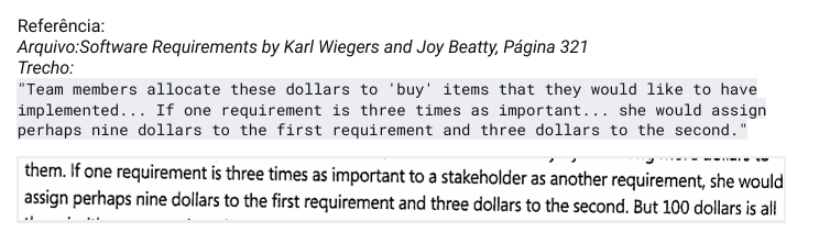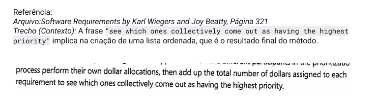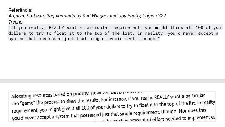 | 9 | Foi considerado o risco de enviesamento (“game the process”), em que participantes poderiam distorcer os resultados ao concentrar os 100 dólares em um requisito? [1] | Luan Vinícius, Samuel Felipe, Miquéias Ezequiel, Heyttor Augusto, João Pedro | Ver Imagem |