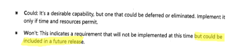 | 6 | Está registrado que os requisitos classificados como Won’t podem ser incluídos em uma versão futura? [2] | Luan Vinícius, Samuel Felipe, Miquéias Ezequiel, Heyttor Augusto, João Pedro | Ver Imagem |
