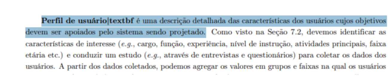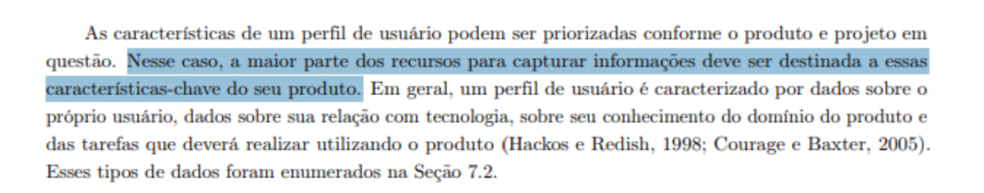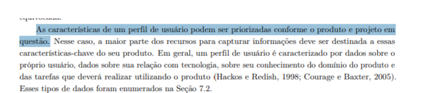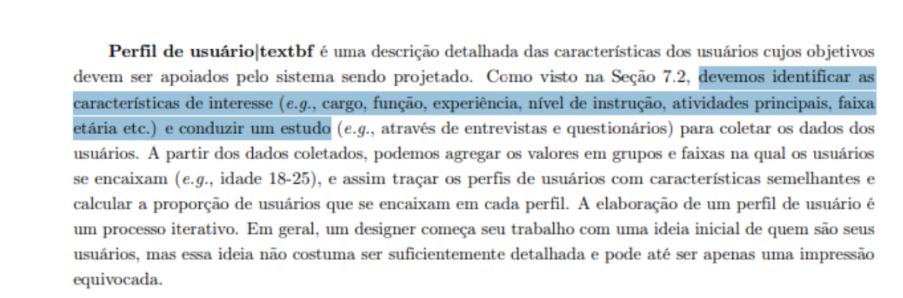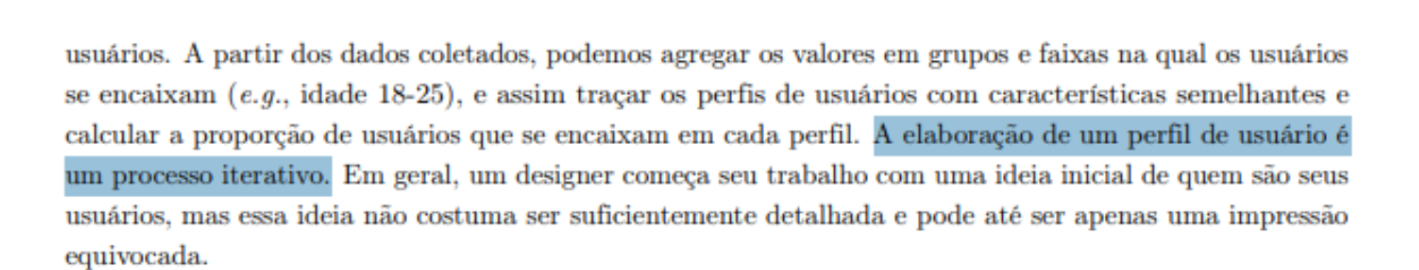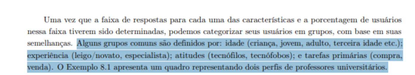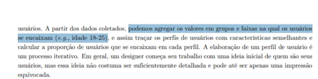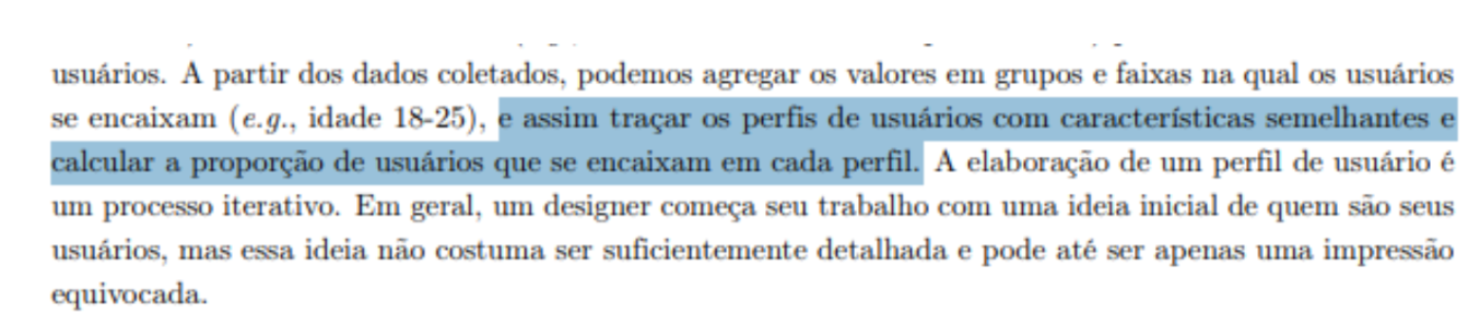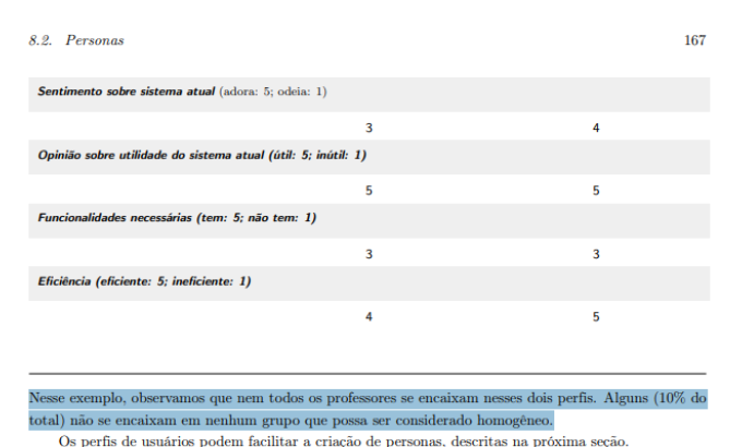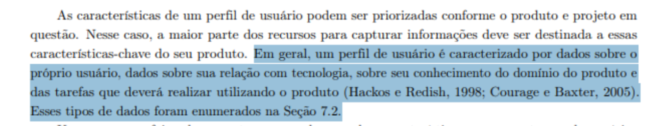 | 8 | Foram consideradas múltiplas dimensões do usuário (dados pessoais, relação com tecnologia, conhecimento do domínio, tarefas)? | clique aqui |